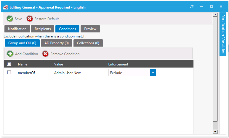 • In the above example if the target user or the requester is in the Admin User New Security Group, the notification will not be sent.