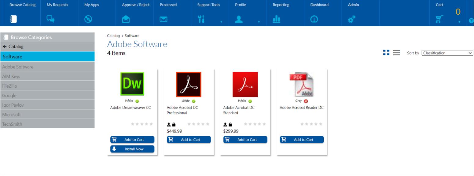 A catalog item can have only single classification. In the above image, Adobe Dreamweaver CC is classified as White which is a Preferred type. Adobe Acrobat Reader DC is classified as Grey which is Non-Preferred type.
