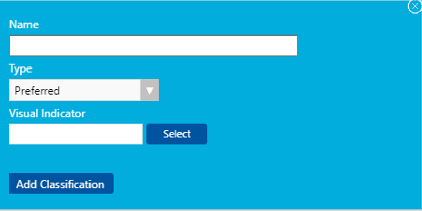 6. Click Select button under Visual Indicator to add image. The image can be jpeg, gif, or png. Other formats are not supported. Only 1 image can be associated to a classification. The image size should be less than 1 MB.