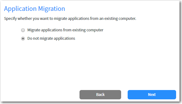 7. If you want to migrate applications from an existing computer to the target computer, select the Migrate applications from existing computer option. If you select this option, the Select computer field is displayed, where you are prompted to search for the existing computer.