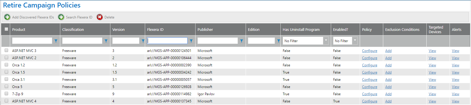 Search Flexera IDsClick to create a campaign to retire an application that could be installed in your enterprise in the future. The Search for Flexera ID view opens, listing listing all of the existing applications/versions in the FlexNet Manager Suite database.